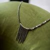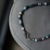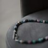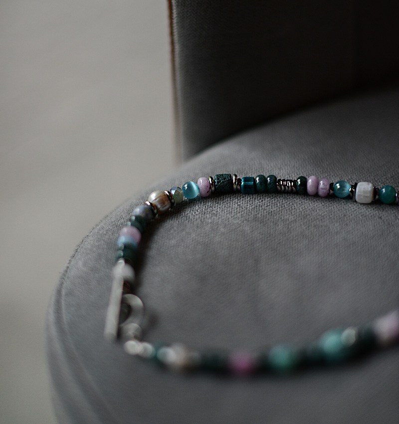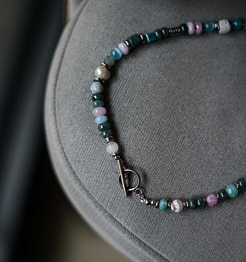This necklace is crafted with a mix of natural stones and beads including agate, jade, hematite, cat eye (chrysoberyl), and clay. Each bead is different, giving the piece a soft, playful, and unique look.