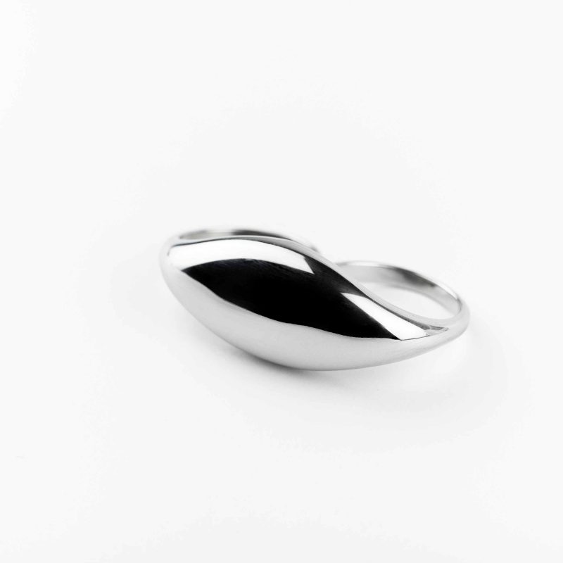 This silver sculptural ring features a smooth, flowing design with a high-polish finish that reflects light beautifully. Its modern shape creates a subtle statement and instantly enhances any look, making it perfect for everyday wear or special occasions.