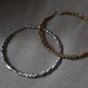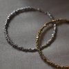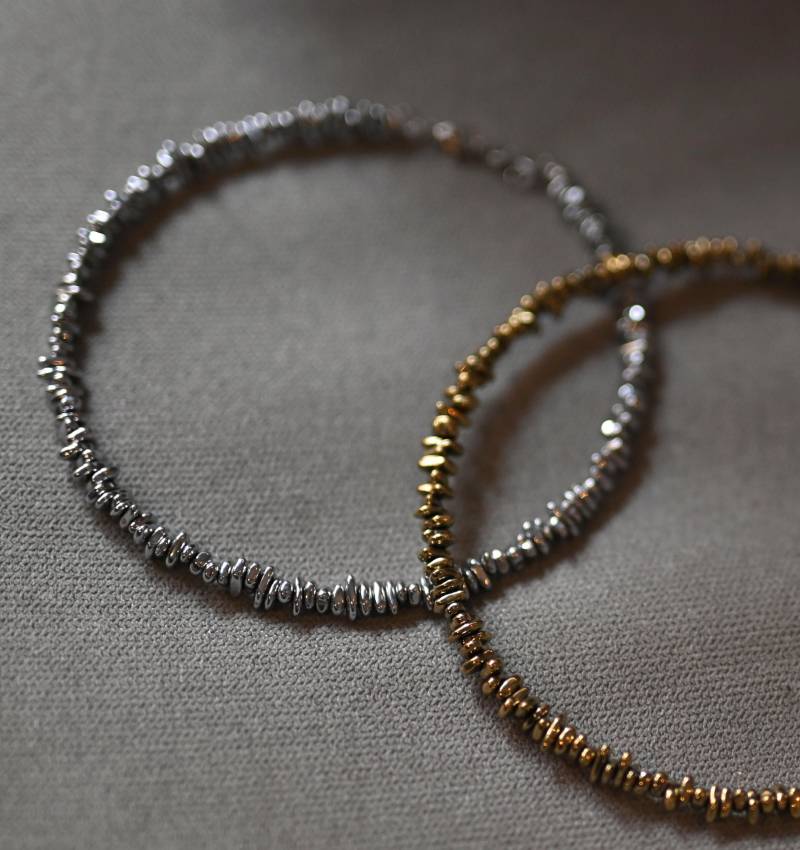 Embrace an edgy elegance with our ‘Mad Love’ Natural Hematite Choker Necklace. This stunning piece features genuine hematite beads meticulously arranged on a metal line to create a sleek choker design. The choker necklace boasts a length of approximately 37 cm and is secured with a lobster clasp closure, complete with a 7 cm extender for adjustable wear. This chic piece features genuine hematite beads of two metallic hue options: silver and gold.