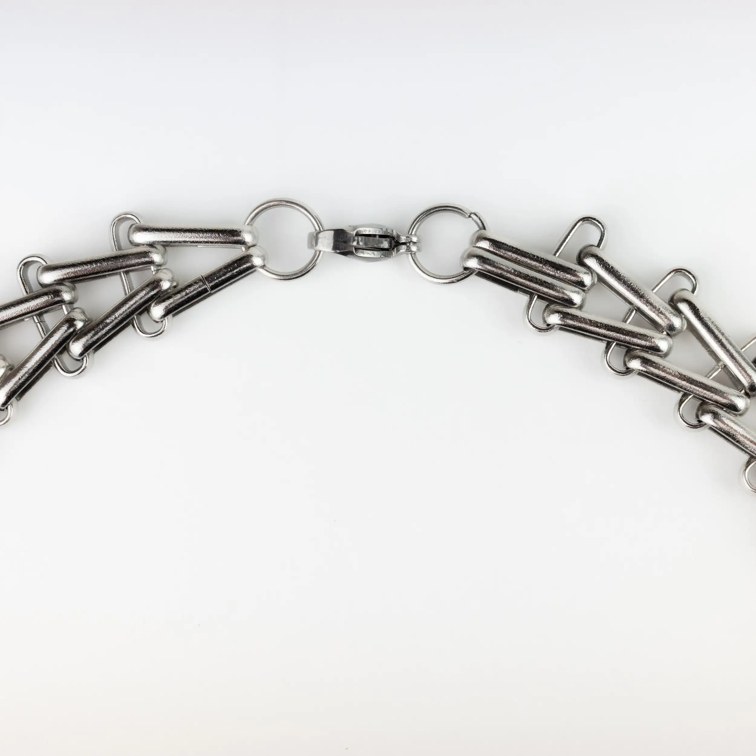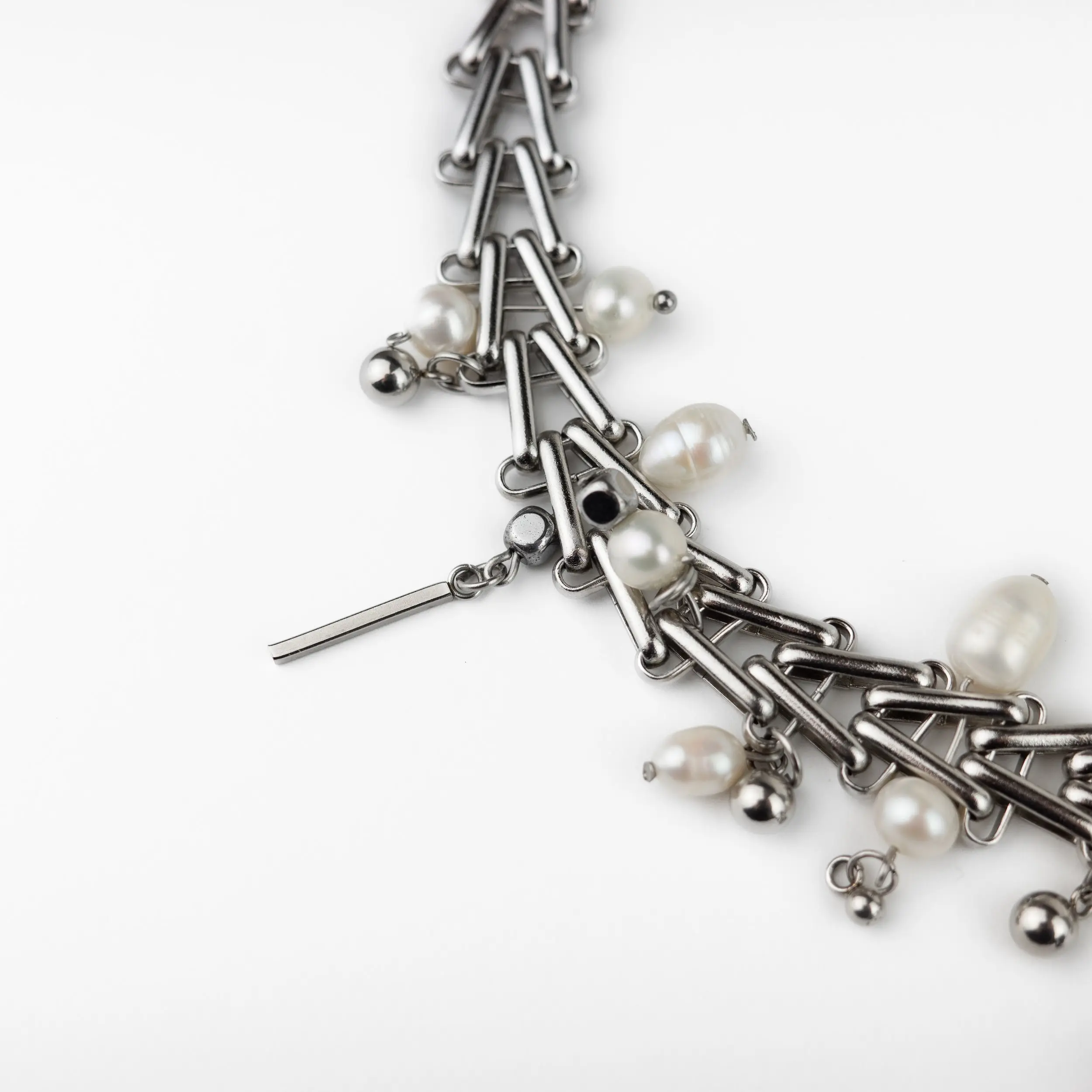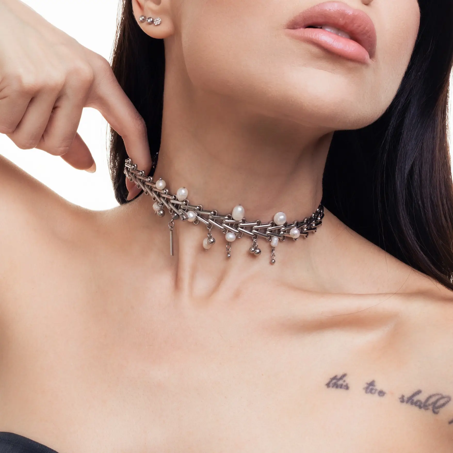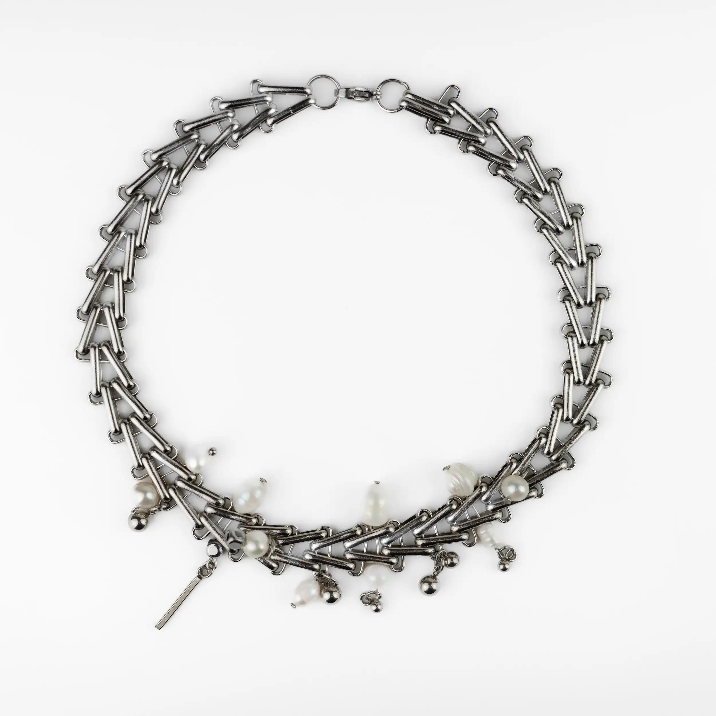 This statement choker combines structured stainless-steel chain links with delicate freshwater pearls, creating a striking contrast between industrial edge and soft detail. Designed to sit close to the neck, it adds instant charm to any look.