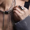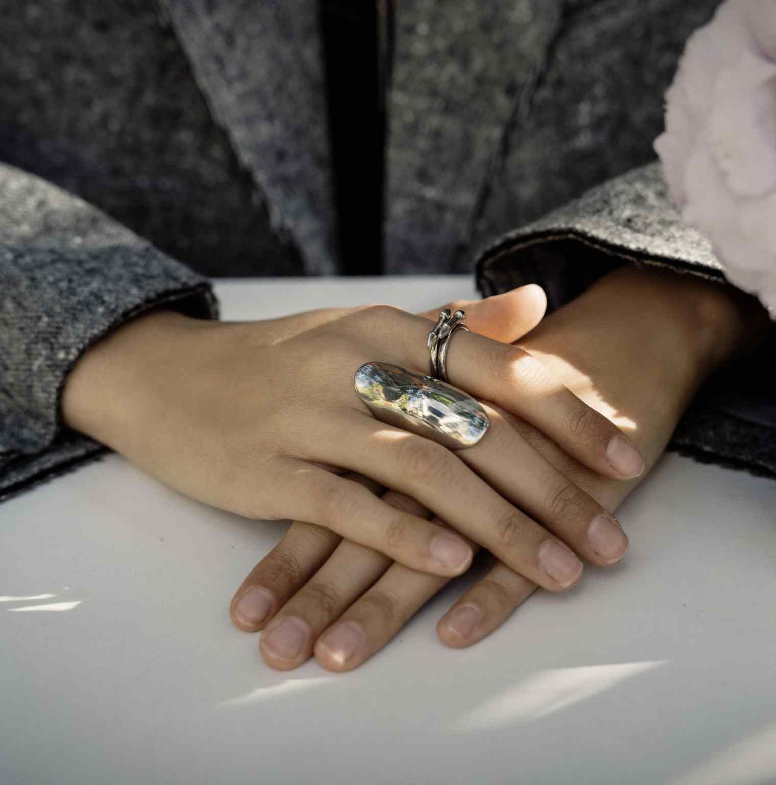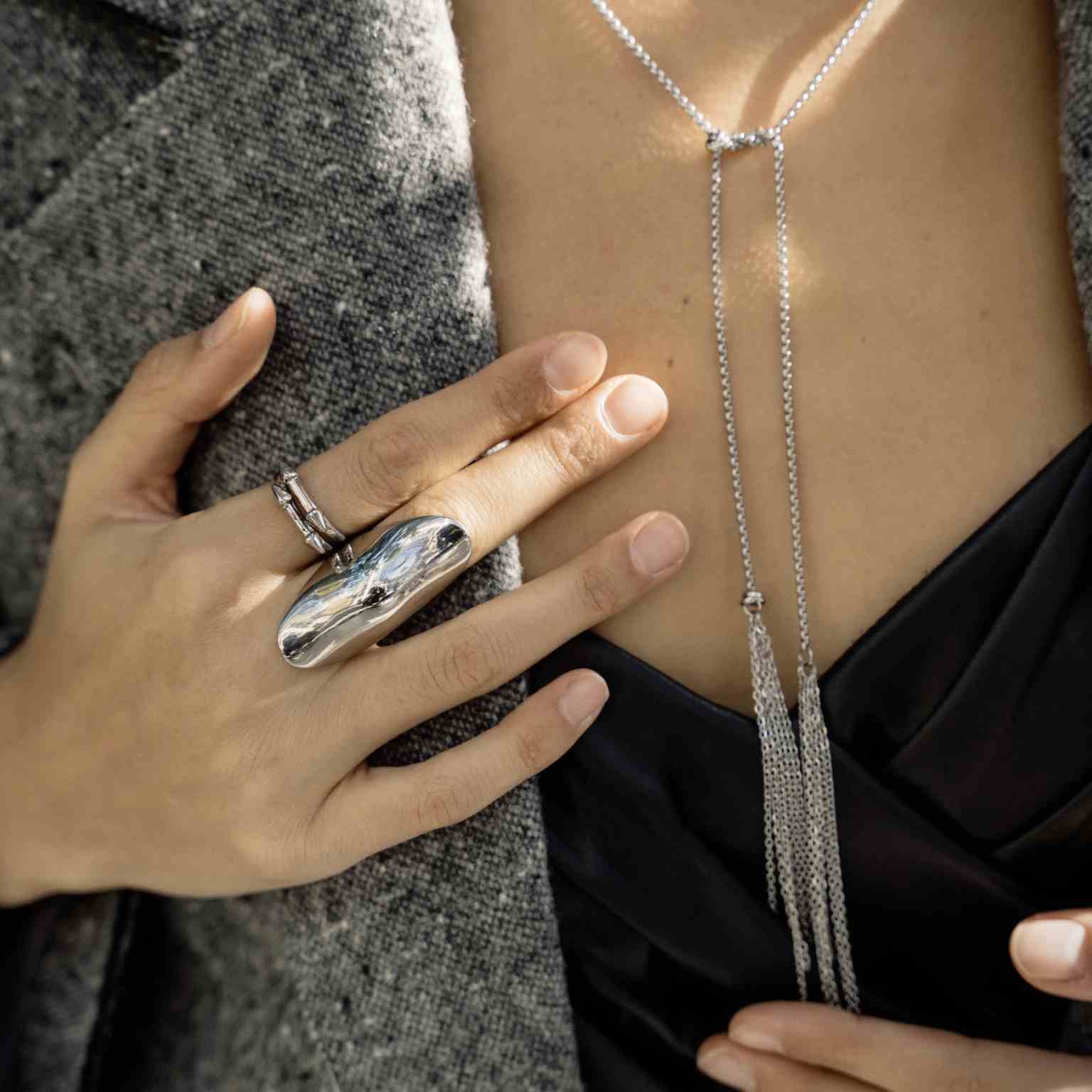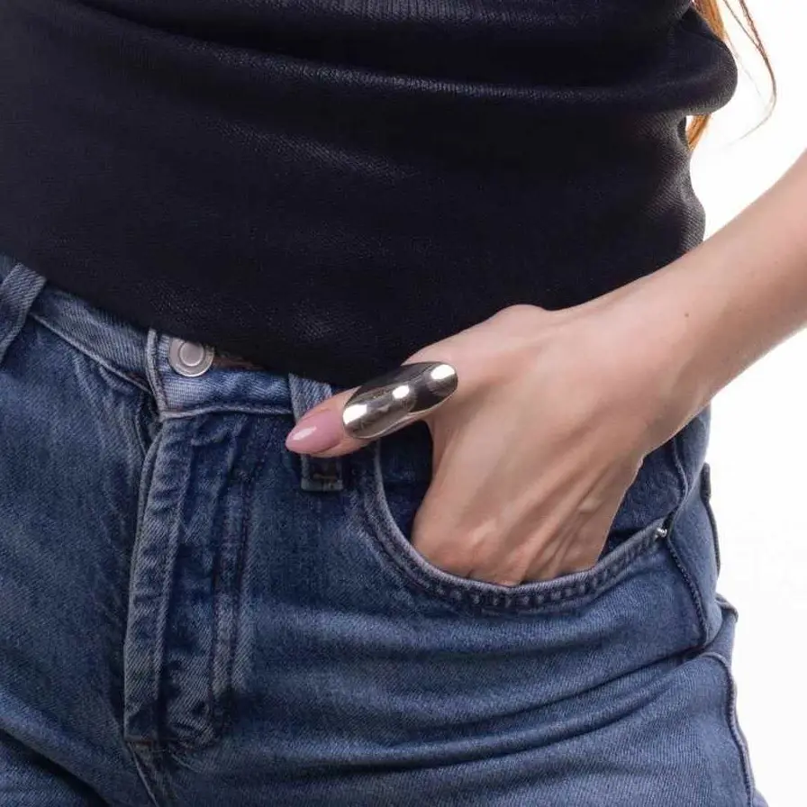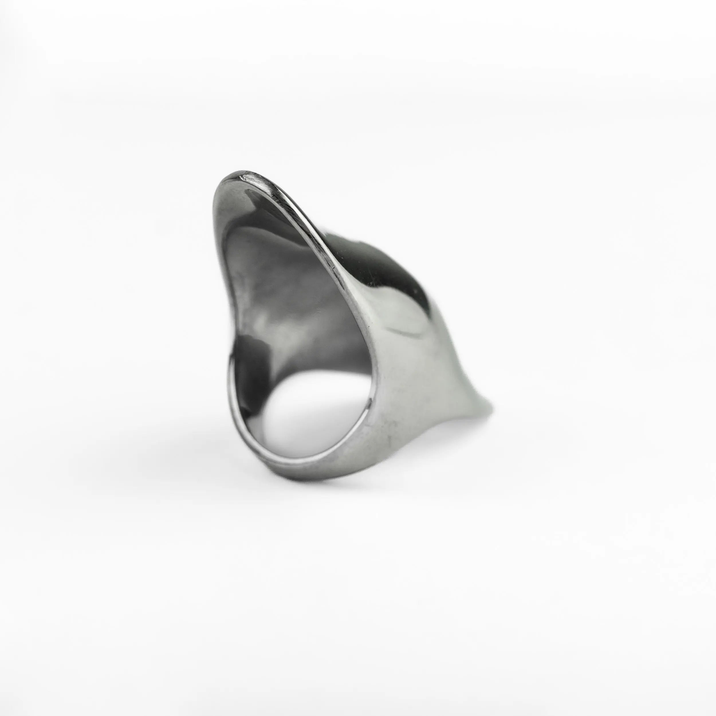 This sculptural silver ring features a curved shape with a high-polish mirror finish that reflects light beautifully. Designed as a bold statement piece, it adds a modern, artistic edge to any look.