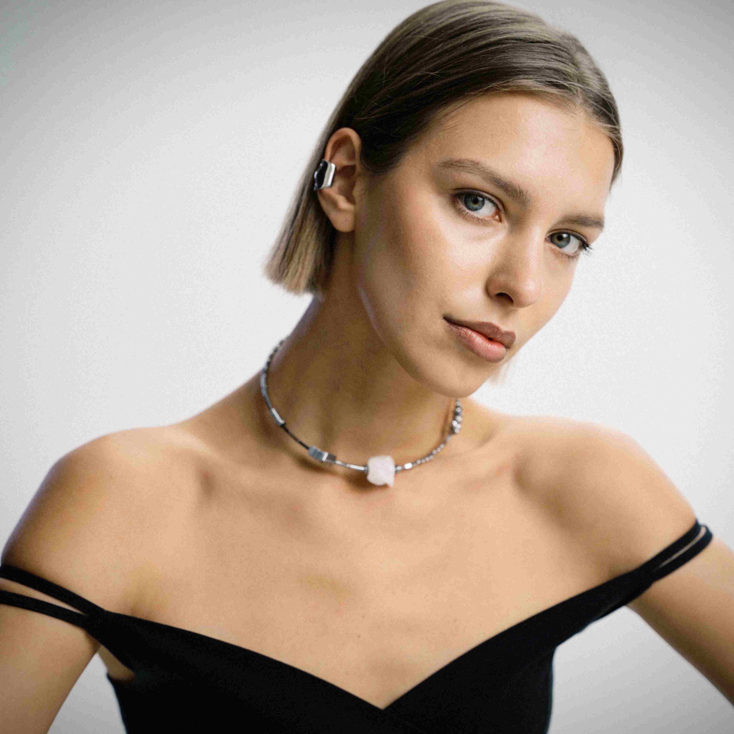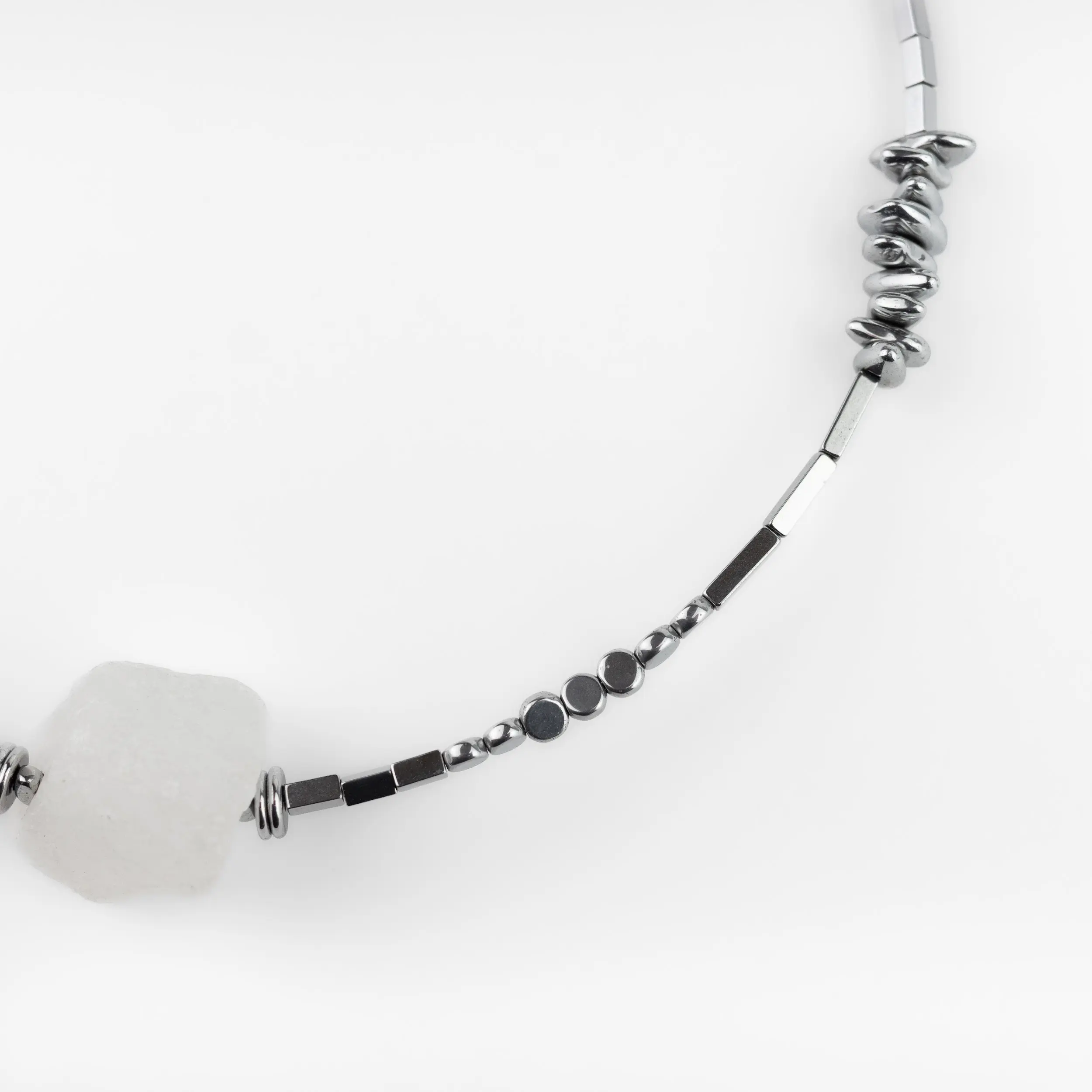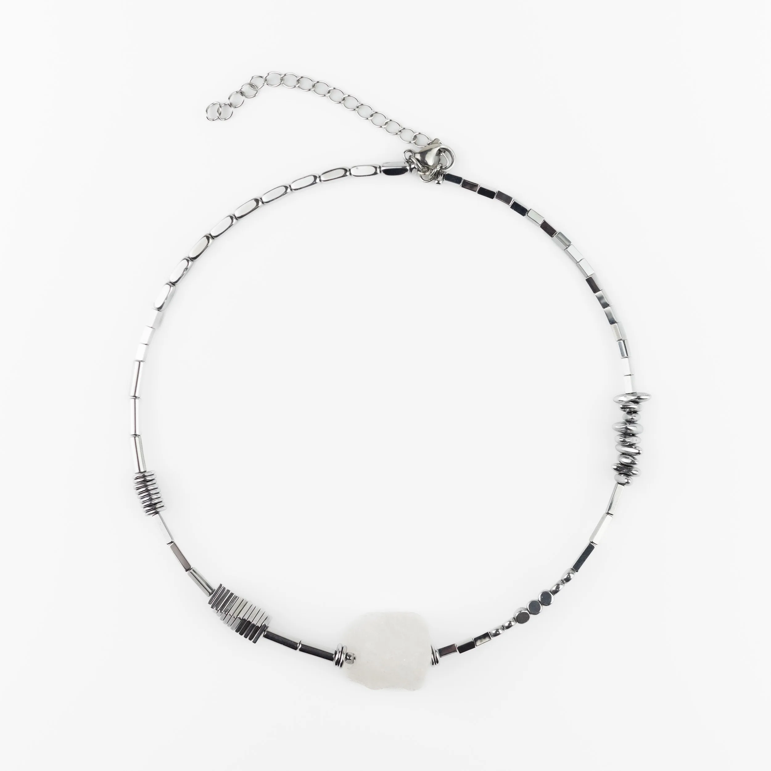 This modern choker features a bold white quartz centerpiece with hematite and stainless steel details.