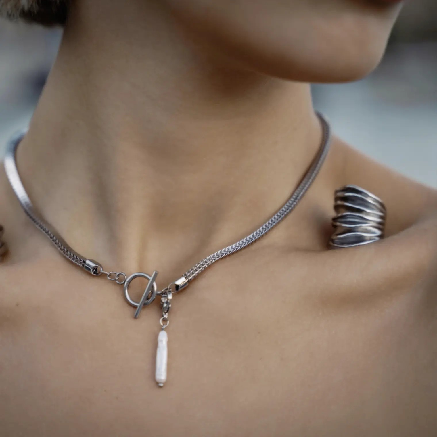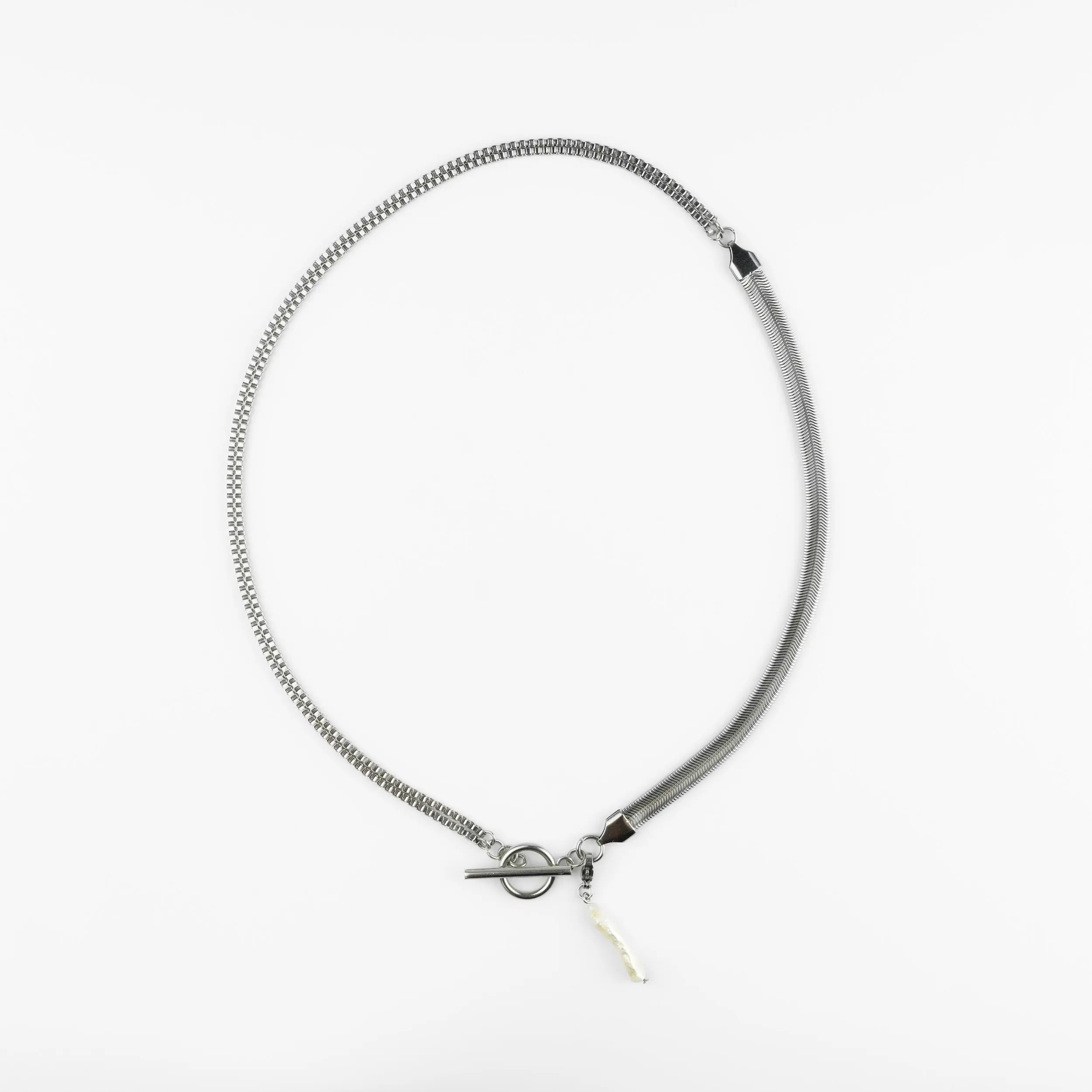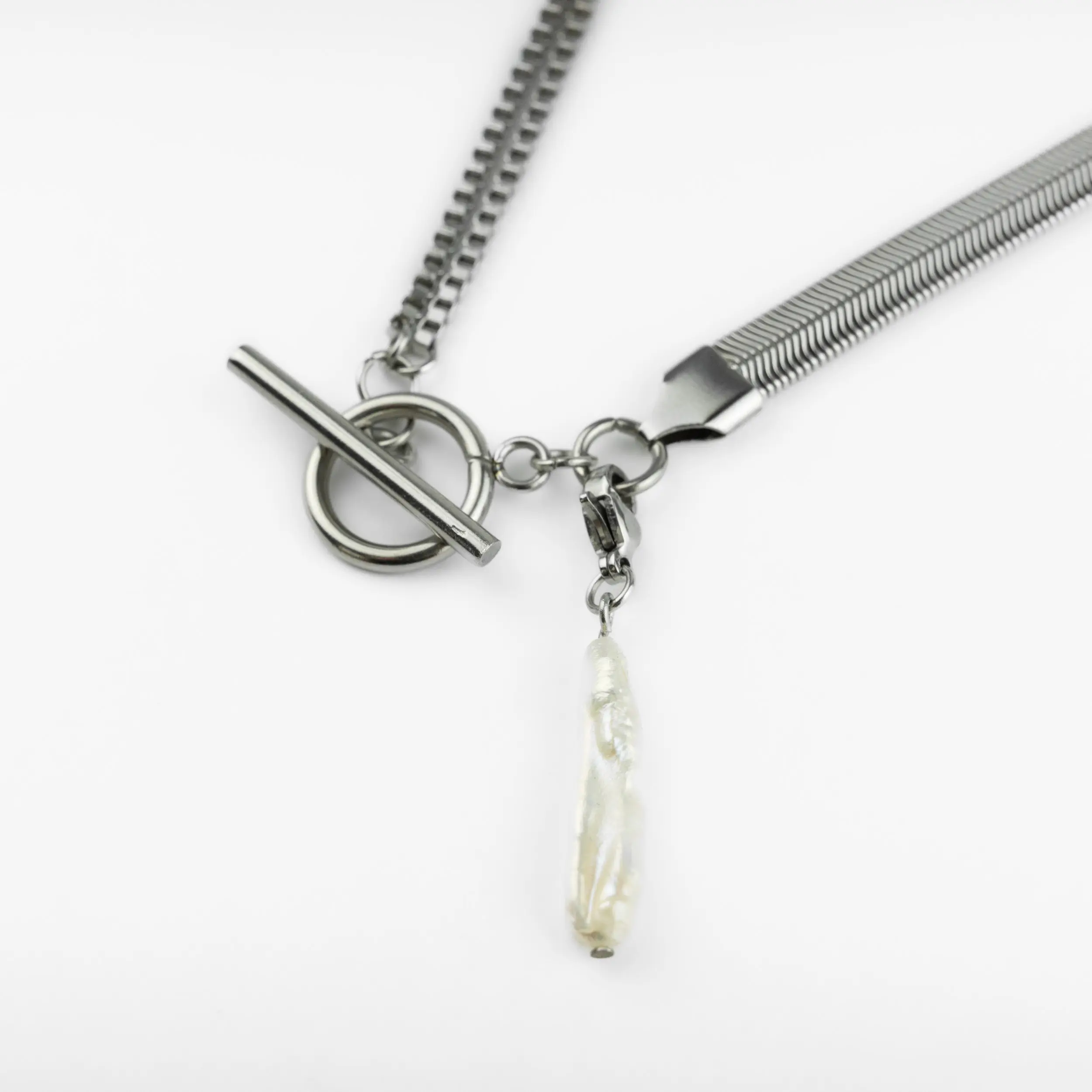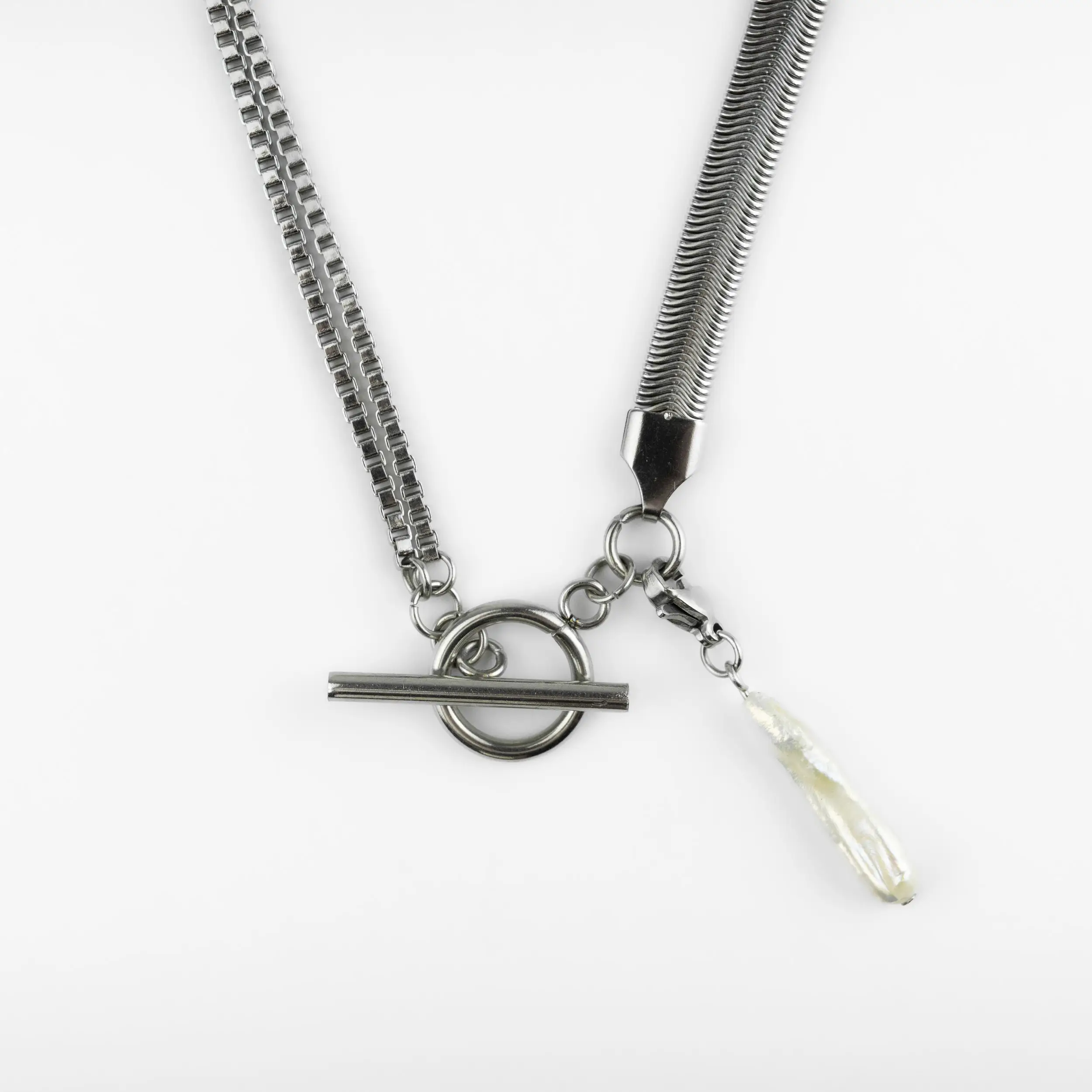 This toggle chain necklace combines mixed silver chains with a natural stick freshwater pearl for a striking yet elegant finish.